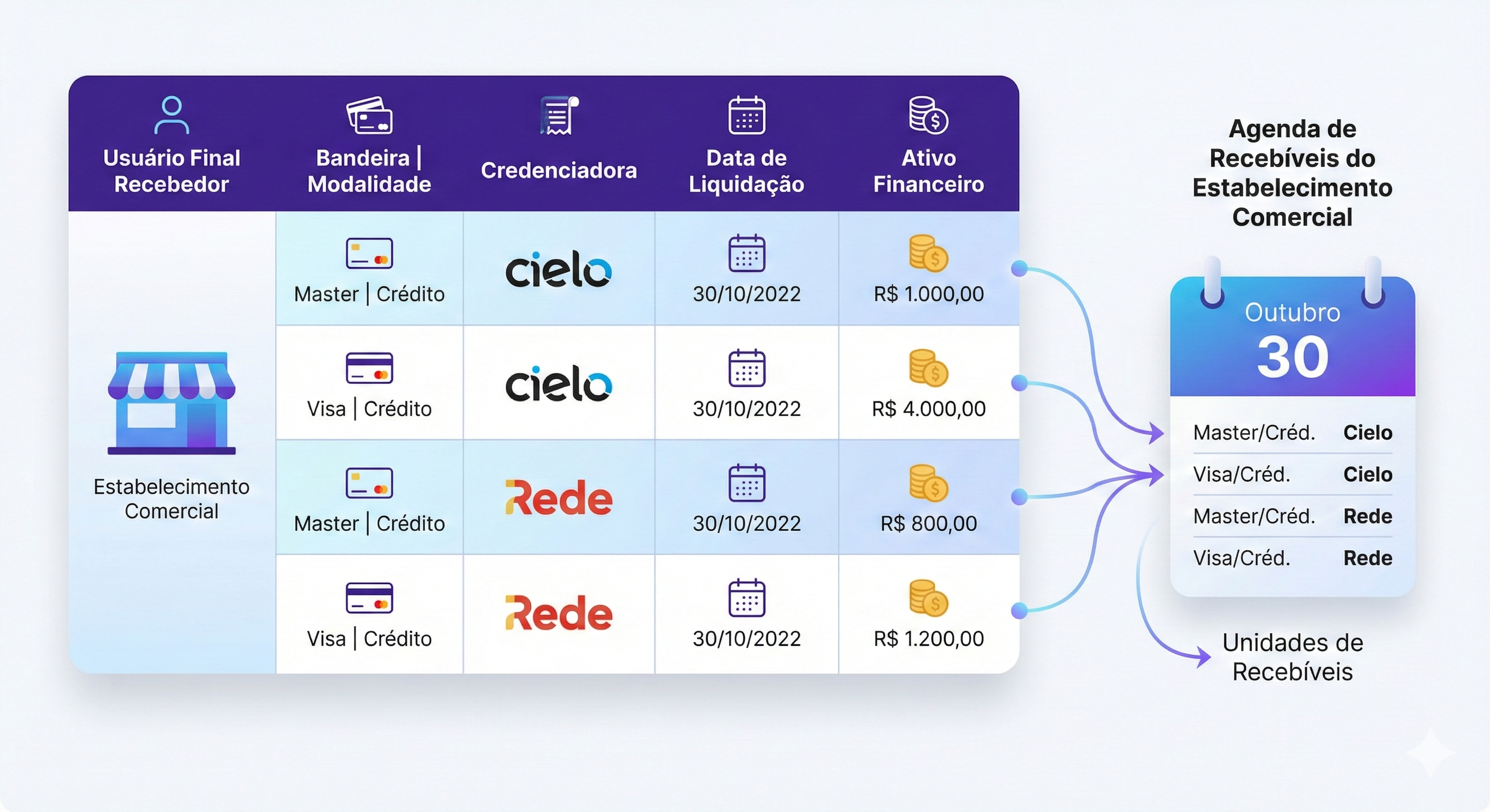 Exemplo de Agenda de Recebíveis de um Estabelecimento Comercial que utiliza um POS da Cielo e outro da Rede